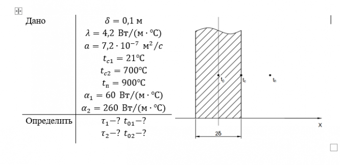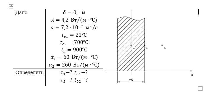 Задача 1. Стенка толщиной 0,2 м изготовлена из огнеупорного материала с коэффициентом теплопроводности и коэффициентом температуропроводности . Этот материал не воспламеняется до температуры . При испытаниях стенку помещают в пламя, охватывающее обе ее поверхности. Средняя температура пламени , начальная температура стенки . Определить минимальный и максимальный промежутки времени, в течение которых стенка может пробыть в огне до воспламенения, предполагая, что коэффициент теплоотдачи от пламени к стенке может изменяться в интервале от 60 до . Найти значения температуры в среднем сечении стенки в эти моменты времени.