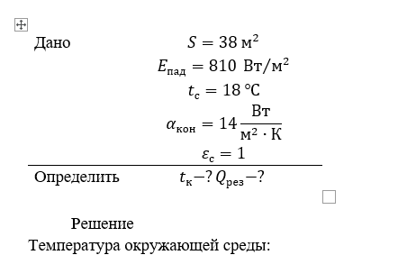 Задача 3. Солнечный коллектор, расположенный на крыше дома, имеет площадь . Плотность потока солнечного излучения, падающего на коллектор, равна . Окружающую среду можно считать черной, ее температура . Определить температуру коллектора, пренебрегая кондуктивными потерями, считая коэффициент теплоотдачи конвекцией равным . Рассчитать результирующий тепловой поток между коллектором и окружающей средой.