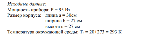 Задача 2. Вариант 74. Электронный прибор потребляет при работе 95 Вт мощности и помещен в корпус из тонколистовой стали размерами 27х27х30см