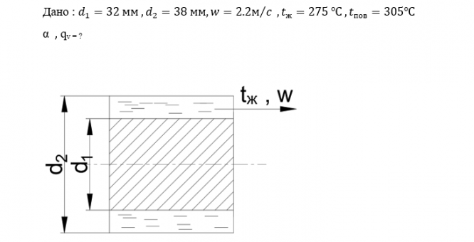 Задача 2. Тепловыделяющий элемент ядерного реактора имеет наружный диаметр 32 мм. Твэл находится в трубе внутренним диаметром 38 мм. В кольцевом зазоре движется охлаждающая вода со скоростью 2,2 м/с и средней температурой 275 ℃. Найти средний коэффициент теплоотдачи и мощность внутренних источников теплоты qv, Вт/м3, твэла, если температура его поверхности 305 ℃.