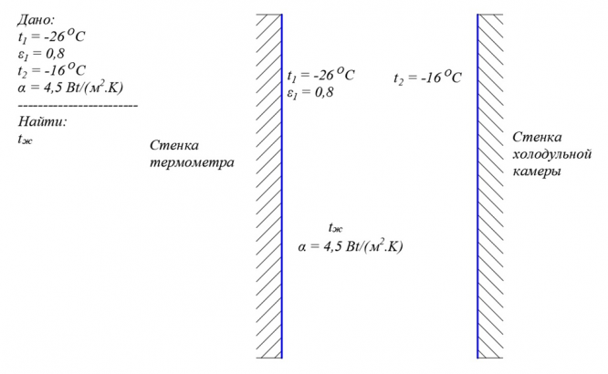 Задача 3. Вариант 65. Ртутный термометр в холодильной камере показал температуру -26ОС. Степень черноты стекла термометра 0,80. Температура стенки холодильной камеры равна -16ОС.