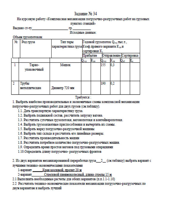 ДЗ: КОМПЛЕКСНАЯ МЕХАНИЗАЦИЯ ПОГРУЗОЧНО-РАЗГРУЗОЧНЫХ РАБОТ НА ГРУЗОВЫХ ПУНКТАХ СТАНЦИИ вариант 34