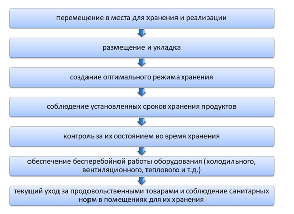 Правильная организация хранения продовольственных товаров в магазине обеспечивает сохранность качества и количества продуктов, их максимальную реализацию, снижает материальные издержки и трудовые ресурсы, увеличивает рентабельность торговли. Процесс хранения товаров в розничной торговле должен осуществляться с соблюдением основных технологических операций (рис.1).