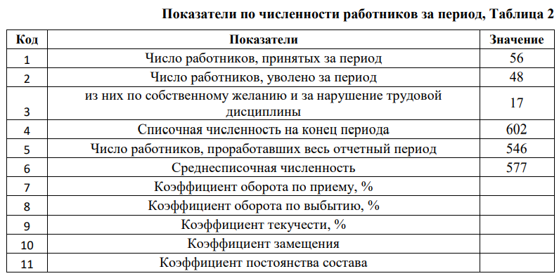 Дано: В организации за определенный период было принято 56 человек, уволено 48 человек, из них по собственному желанию и за нарушение трудовой дисциплины 17 человек. Списочная численность на конец периода 602 человек, число работников, проработавших весь отчетный период 546 человек, среднесписочная численность 577 человек.