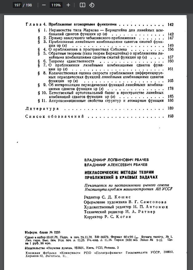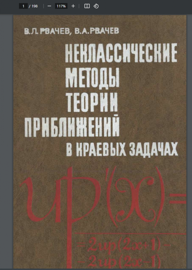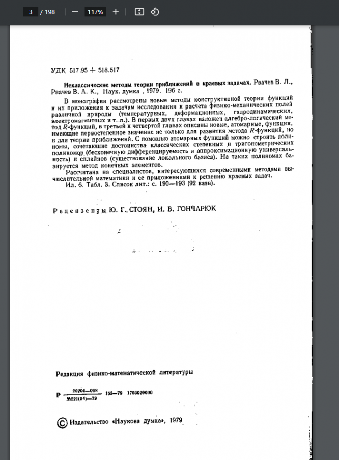 Рвачев В.Л., Рвачев В.А. - Неклассические методы теории приближений в краевых задачах (1979) для Атомарные функции и вейвлеты в физических приложениях  УДК 517.95 + 518.517 Неклассические методы теории приближений в краевых задачах. Рвачев В. Л., Рвачев В. А. К., Наук. думка, 1979. 196 с. В монографии рассмотрены новые методы конструктивной теории функций и их приложения к задачам исследования и расчета физико-механических полей гидродинамических, различной природы (температурных, деформационных, электромагнитных и т.п.). В первых двух главах изложен алгебро-логический ме- тод -функций, в третьей и четвертой главах описаны новые, атомарные, функции, имеющие первостепенное значение не только для развития метода R-функций, но и для теории приближений.