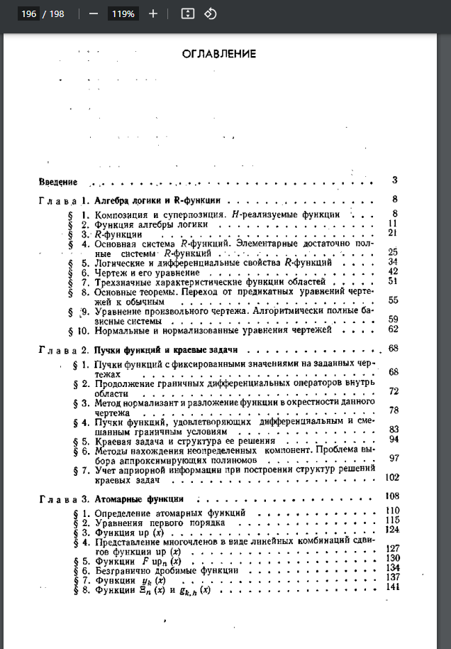 Алгебра логики и К-функции § 1. Композиция и суперпозиция. Н-реализуемые функции § 2. Функция алгебры логики § 3. R-функции conversesvos corcoscosios 4. Основная система R-функций. Элементарные достаточно пол- ные системы -функций 5. Логические и дифференциальные свойства R-функций 6. Чертеж и его уравнение 7. Трехзначные характеристические функции областей 8. Основные теоремы. Переход от предикатных уравнений черте- жей к обычным § 9. Уравнение произвольного чертежа. Алгоритмически полные ба- зисные системы § 10. Нормальные и нормализованные уравнения чертежей Глава 2. Пучки функций и краевые задачи . тежах § 2. Продолжение граничных дифференциальных операторов внутрь области § 3.