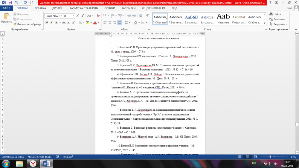 ВКР: Дипломная работа "взаимодействия гостиничного предприятия с туристскими фирмами и корпоративными клиентами"