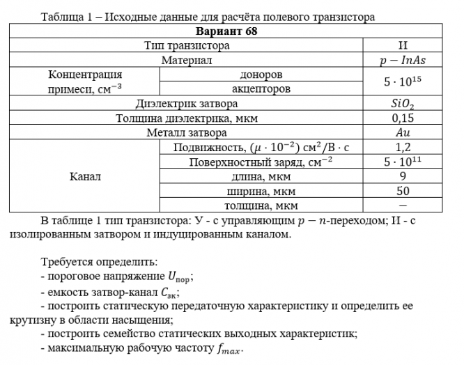 Таблица 1 – Исходные данные для расчёта полевого транзистора