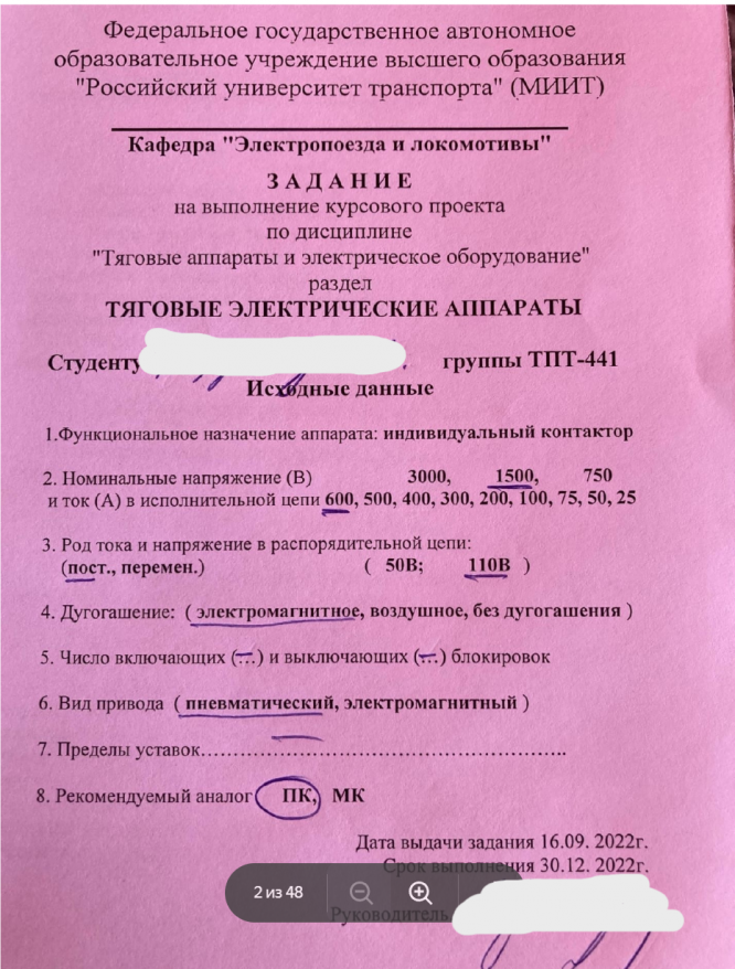 Тяговые аппараты и электрическое оборудование электроподвижного состава - U=3000(В), I=400(A), Iпост Uпост=110(В), электромагнитное, пневматический, ПК ВВЕДЕНИЕ4 1 Выбор конструктивной схемы и конструктивных форм. Компоновка конструкции5 2 Проектирование токоведущего контура контактора8 2.1 Расчет токоведущих частей8 2.2 Расчет коммутационных контактов10 2.2.1 Определение ширины контакта12 2.2.2 Определение расчетной силы нажатия контактов13 2.2.3 Определение величины предельного тока13 2.2.4 Определение тока аварийной перегрузки14 2.2.5 Определение требуемой силы нажатия контактов14 2.2.6 Выбор унифицированной контактной накладки15 2.2.7 Определение износостойкости контактов15 2.3 Проектирование контактных соединений17 2.3.1 Неразборные контактные соединения17 2.3.2 Разборные контактные соединения17 2.4 Разработка эскиза контакта17 3 Расчет дугогасительного устройства18 3.1 Выбор системы дугогашения18 3.2 Выбор конструкции, размеров дугогасительной камеры и расчет электромагнитной дугогасительной системы20 3.3 Расчет параметров дугогасительной катушки22 3.4 Расчет параметров стального сердечника24 .