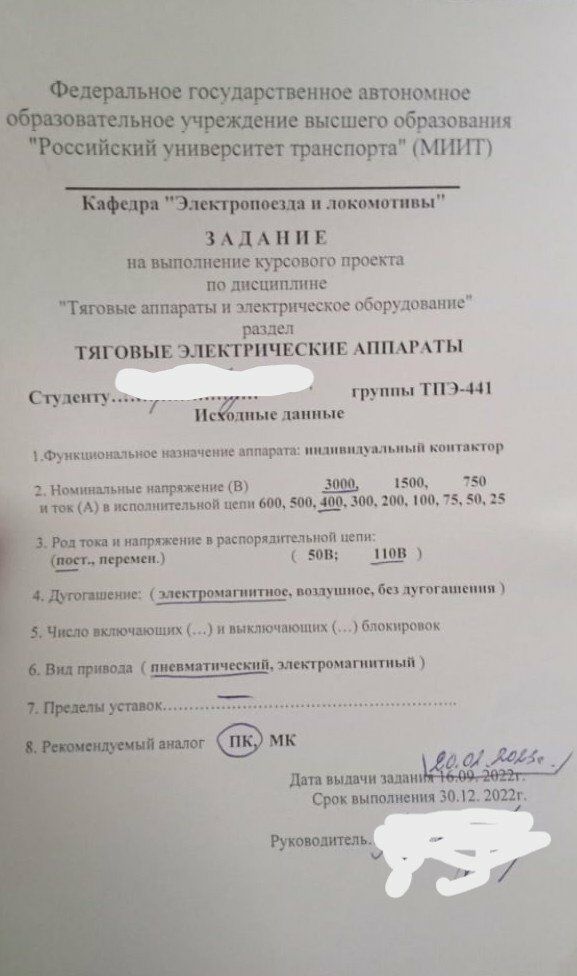 Показать/скрыть дополнительное описаниеТяговые аппараты и электрическое оборудование электроподвижного состава - U=3000(В), I=400(A), Iпост Uпост=110(В), электромагнитное, вкл выкл блокировок нет, пневматический, ПК ВВЕДЕНИЕ4 1 Выбор конструктивной схемы и конструктивных форм. Компоновка конструкции5 2 Проектирование токоведущего контура контактора8 2.1 Расчет токоведущих частей8 2.2 Расчет коммутационных контактов10 2.2.1 Определение ширины контакта12 2.2.2 Определение расчетной силы нажатия контактов13 2.2.3 Определение величины предельного тока13 2.2.4 Определение тока аварийной перегрузки14 2.2.5 Определение требуемой силы нажатия контактов14 2.2.6 Выбор унифицированной контактной накладки15 2.2.7 Определение износостойкости контактов15 2.3 Проектирование контактных соединений17 2.3.1 Неразборные контактные соединения17 2.3.2 Разборные контактные соединения17 2.4 Разработка эскиза контакта17 3 Расчет дугогасительного устройства18 3.1 Выбор системы дугогашения18 3.2 Выбор конструкции, размеров дугогасительной камеры и расчет электромагнитной дугогасительной системы20 3.3 Расчет параметров дугогасительной катушки22 3.4 Расчет параметров стального сердечника24 .