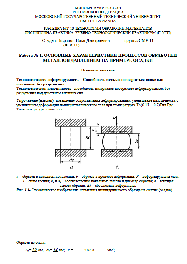 Главная » Учебные материалы » Учебно-технологическая практика (УТП) » Лабораторные работы » МГТУ им. Н.Э.Баумана » 2 семестр » Номер 1 » Основные характеристики процессов обработки металлов давлением на примере осадки