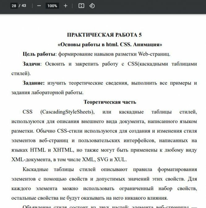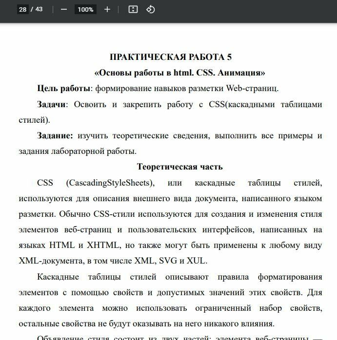 ПРАКТИЧЕСКАЯ РАБОТА 5 «Основы работы в html. CSS. Анимация» Цель работы: формирование навыков разметки Web-страниц. Задачи: Освоить и закрепить работу с CSS(каскадными таблицами стилей). Задание: изучить теоретические сведения, выполнить все примеры и задания лабораторной работы