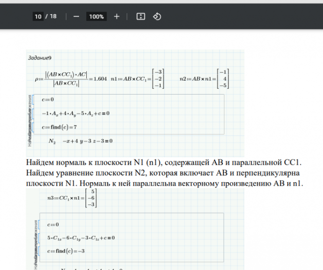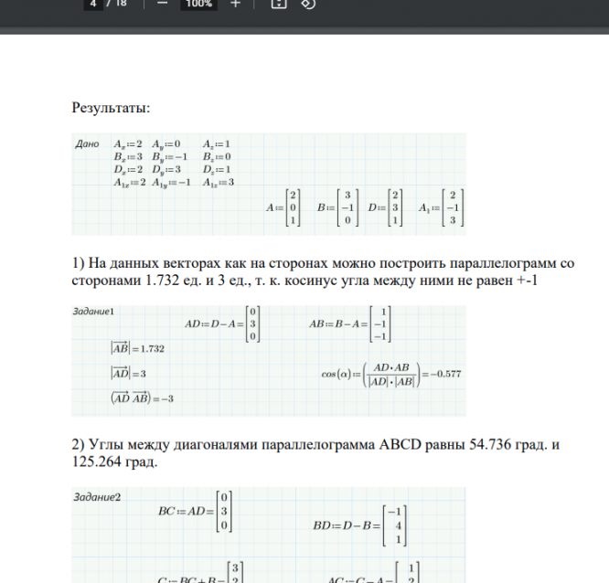 Рассматривались задачи (Вариант 5): Задание 1. Даны точки A, B, D, A1 (вариант соответствует порядковому номера студента по списку). 1. Проверить, можно ли на векторах AB и AD построить параллелограмм. Если да, то найти длины сторон параллелограмма. 2. Найти углы между диагоналями параллелограмма ABCD. 3. Найти площадь параллелограмма ABCD. 4. Убедиться, что на векторах AB, AD, AA1 можно построить параллелепипед. Найти объем этого параллелепипеда и длину его высоты. 5. Найти координаты вектора AH, направленного по высоте параллелепипеда, проведенной из точки A к плоскости основания A1B1C1D1, координаты точки H и координаты единичного вектора, совпадающего по направлению с вектором AH. 6. Найти разложение вектора AH по векторам AB, AD, AA1. 7. Найти проекцию вектора AH на вектор AA1. 8. Написать уравнения плоскостей: а) P, проходящей через точки A, B, D; б) P1, проходящей через точку A и прямую A1B1; в) P2, проходящей через точку A1 параллельно плоскости P; г) P3, содержащей прямые AD и AA1; д) P4, проходящей через точки A и C1, перпендикулярно плоскости P. 9. Найти расстояние между прямыми, на которых лежат ребра AB и CC1; написать канонические и параметрические уравнения общего к ним перпендикуляра. 10.Найти точку A2, симметричную точке A1 относительно плоскости основания ABCD. 11.Найти угол между прямой, на которой лежит диагональ A1C и плоскостью основания ABCD. 12.Найти острый угол между плоскостями ABCD (плоскость P) и ABB1A1 (плоскость P1).