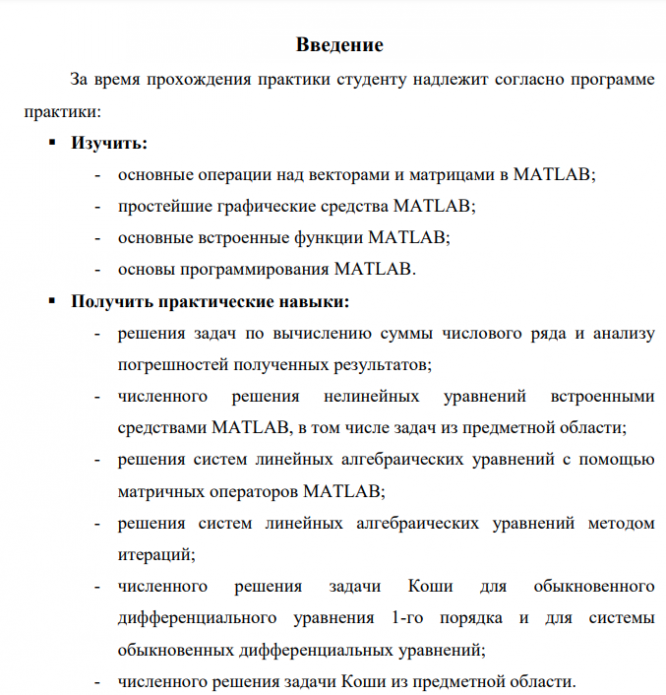 За время прохождения практики студенту надлежит согласно программе практики:  Изучить: - основные операции над векторами и матрицами в MATLAB; - простейшие графические средства MATLAB; - основные встроенные функции MATLAB; - основы программирования MATLAB.