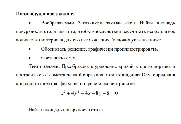 Текст задачи. Преобразовать уравнение кривой второго порядка и построить его геометрический образ в системе координат Оxy, определив координаты центра, фокусов, полуоси и эксцентриситет: 2 2 x y xy + − + −= 4 4 8 80 Найти площадь поверхности стола.