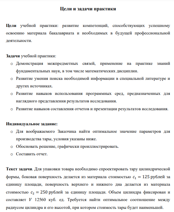 Текст задачи. Для упаковки товара необходимо спроектировать тару цилиндрической формы, боковая поверхность делается из материала стоимостью с1 = 125 рублей за единицу площади, поверхность верхнего и нижнего дна делается из материала стоимостью с2 = 250 рублей за единицу площади. Объем цилиндра фиксирован и составляет 12560 куб. ед. Требуется найти оптимальное соотношение между радиусом цилиндра и его высотой, при котором стоимость тары будет наименьшей.