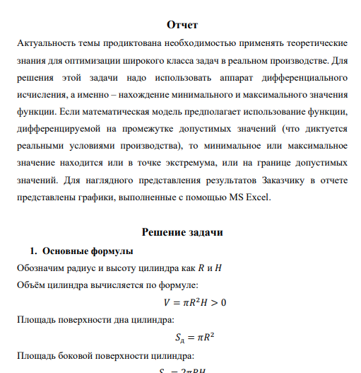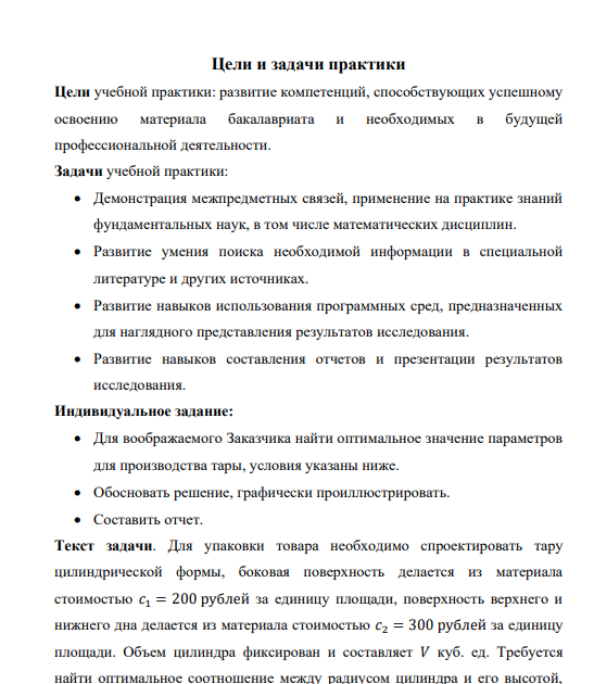 Текст задачи. Для упаковки товара необходимо спроектировать тару цилиндрической формы, боковая поверхность делается из материала стоимостью = 200 рублей за единицу площади, поверхность верхнего и нижнего дна делается из материала стоимостью = 300 рублей за единицу площади. Объем цилиндра фиксирован и составляет куб. ед. Требуется найти оптимальное соотношение между радиусом цилиндра и его высотой, при котором стоимость тары будет наименьшей.
