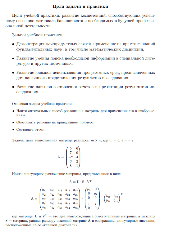 Основная задача учебной практики: • Найти оптимальный способ разложения матрицы для применения его к изображениям. • Обосновать решение на приведенном примере. • Составить отчет. Задача: дана вещественная матрица размером m × n, где m = 5, а n = 2.