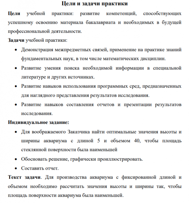 Текст задачи. Для производства аквариума с фиксированной длиной и объемом необходимо рассчитать значения высоты и ширины так, чтобы площадь поверхности аквариума была наименьшей.