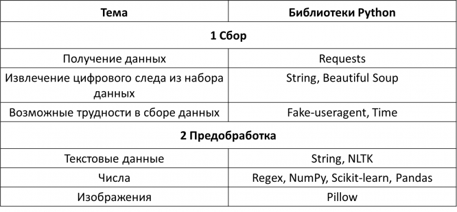 В пособие рассматривается применение Python для работы с данными. Стоит отметить, что для изучения выбраны наиболее простые программные инструменты для наилучшего восприятия начинающими. В таблице ниже представлены библиотеки Python для выполнения необходимых в работе с цифровым следом действий.