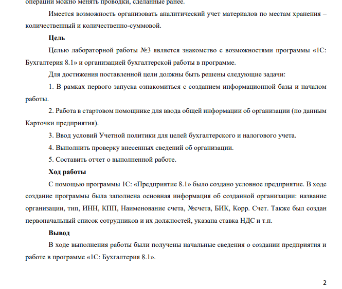 Целью лабораторной работы №3 является знакомство с возможностями программы «1С: Бухгалтерия 8.1» и организацией бухгалтерской работы в программе. Для достижения поставленной цели должны быть решены следующие задачи: 1. В рамках первого запуска ознакомиться с созданием информационной базы и началом работы. 2. Работа в стартовом помощнике для ввода общей информации об организации (по данным Карточки предприятия). 3. Ввод условий Учетной политики для целей бухгалтерского и налогового учета. 4. Выполнить проверку внесенных сведений об организации. 5. Составить отчет о выполненной работе.