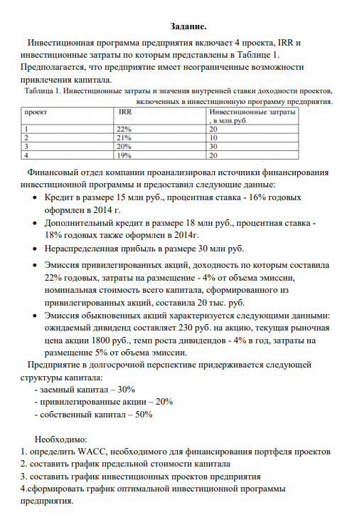 Инвестиционная программа предприятия включает 4 проекта, IRR и инвестиционные затраты по которым представлены в Таблице 1. Предполагается, что предприятие имеет неограниченные возможности привлечения капитала