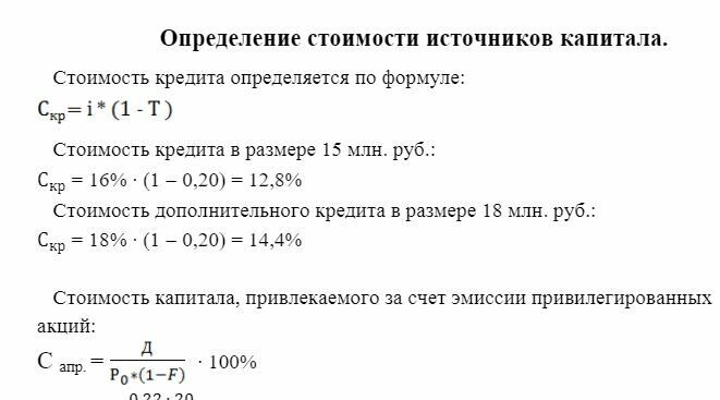Финансовый отдел компании проанализировал источники финансирования инвестиционной программы и предоставил следующие данные: Кредит в размере 15 млн руб., процентная ставка - 16% годовых оформлен в 2014 г. Дополнительный кредит в размере 18 млн руб., процентная ставка - 18% годовых также оформлен в 2014г. Нераспределенная прибыль в размере 30 млн руб. Эмиссия привилегированных акций, доходность по которым составила 22% годовых, затраты на размещение - 4% от объема эмиссии, номинальная стоимость всего капитала, сформированного из привилегированных акций, составила 20 тыс. руб. Эмиссия обыкновенных акций характеризуется следующими данными: ожидаемый дивиденд составляет 230 руб. на акцию, текущая рыночная цена акции 1800 руб., темп роста дивидендов - 4% в год, затраты на размещение 5% от объема эмиссии. Предприятие в долгосрочной перспективе придерживается следующей структуры капитала: - заемный капитал – 30% - привилегированные акции – 20% - собственный капитал – 50%