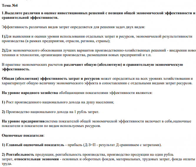 1.Выделите различия в оценке инвестиционных решений с позиции общей экономической эффективности и сравнительной эффективности. Эффективность различных видов затрат определяется для решения задач двух видов: 1)Для выявления и оценки уровня использования отдельных затрат и ресурсов, экономической результативности производства (в рамках предприятия, отрасли, региона, страны); 2)Для экономического обоснования лучших вариантов производственно-хозяйственных решений - внедрения новой техники и технологии, организации производства, размещения новых предприятий и т.п. В практике экономических расчетов различают общую (абсолютную) и сравнительную экономическую эффективность. Общая (абсолютная) эффективность затрат и ресурсов может определяться на всех уровнях хозяйствования и характеризует общую величину экономического эффекта в сопоставлении с отдельными видами затрат ресурсов. На уровне народного хозяйства обобщающими показателями эффективности являются: