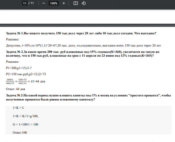 Задача № 1.Вы можете получить 150 тыс.долл через 20 лет либо 10 тыс.долл сегодня. Что выгоднее? Решение: Допустим, i=10%,то 10*(1,1)^20=67,28 тыс. долл, то,следовательно, выгоднее взять 150 тыс.долл через 20 лет Задача № 2.За какое время 200 тыс. руб вложенные под 15% годовых(К=360), увеличатся на такую же величину, что и 150 тыс.руб, вложенные на срок с 11 апреля по 23 июня под 12% годовых(К=365)? Решение: P1=200,p1=15,t1-? Р2=150 тыс.руб,р