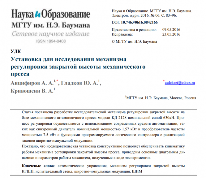 Главная » Учебные материалы » Управление процессами и оборудованием ОМД (МТ-6) » Книги » МГТУ им. Н.Э.Баумана » 9 семестр (1 семестр магистратуры) » Анцифиров А.А. - Установка для исследования механизма регулировки закрытой высоты механического пресса
