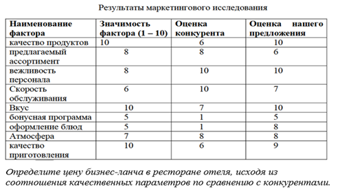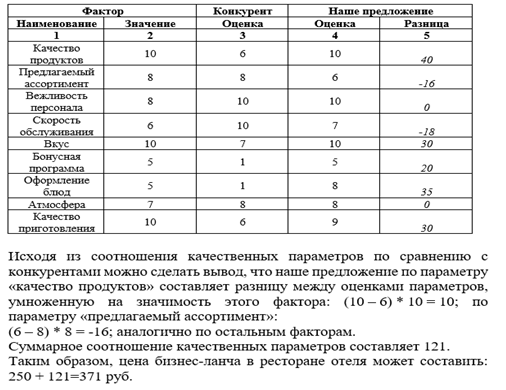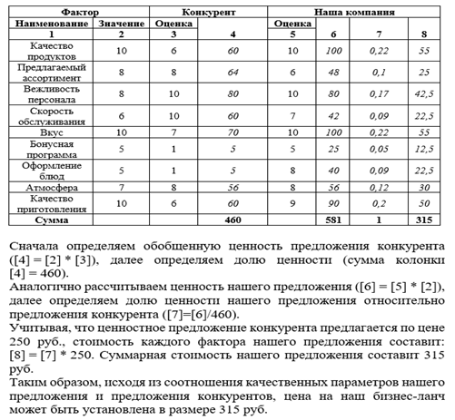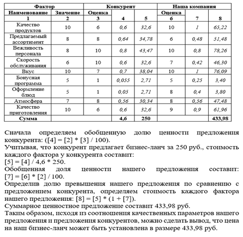 Было проведено маркетинговое исследование ближайшего конкурента по территориальному расположению и предлагаемому ассортименту (стоимость стандартного бизнес-ланча – 250 руб.). Результаты представлены в таблице ниже.