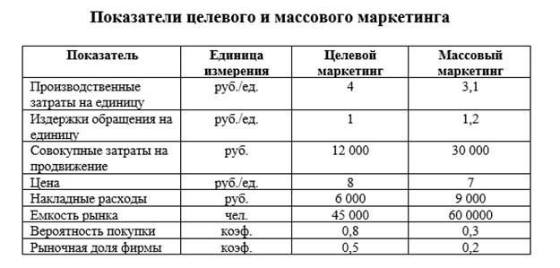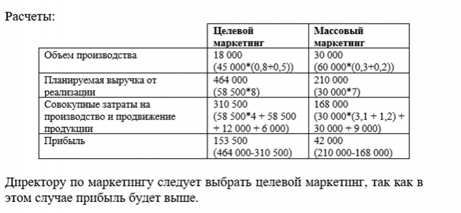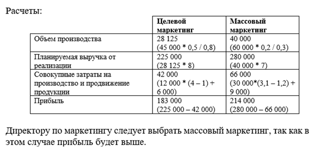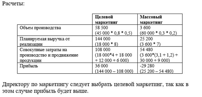 К какому решению должен склониться директор по маркетингу на основе расчётов по целевому и массовому маркетингу (в сравнении)?