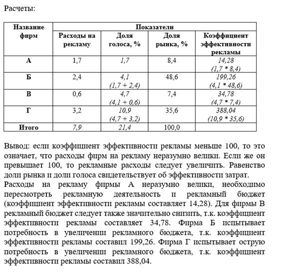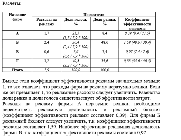 Подсчитайте эффективность рекламных расходов, осуществляемых каждой из фирм, и занесите полученные данные в таблицу. Сделайте выводы.