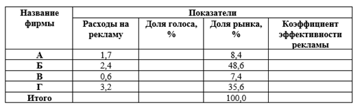 Четыре хорошо известные фирмы (А, Б, В и Г), предлагающие аналогичные услуги по одинаковым ценам, имеют следующие данные о расходах на рекламу и доле рынка (см. таблицу):