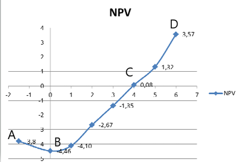 Ниже приведен график чистой приведенной стоимости проекта NPV. В какой точке графика наступает окупаемость проекта