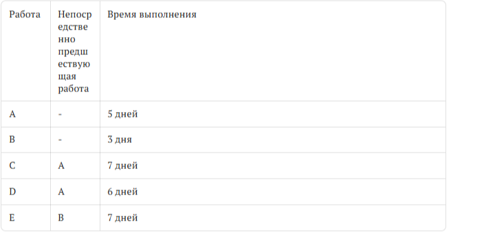 Ниже приведена таблица с данными по этапам проекта и времени их выполнения. По данным таблицы определите, какова продолжительность проекта.
