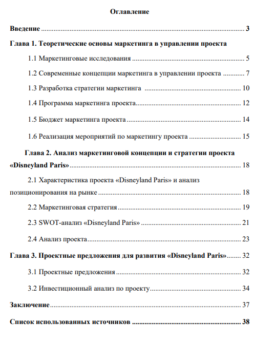 Цель исследования курсовой работы – анализ современной концепции маркетинга в управлении проектами и развития механизма разработки и 4 реализации маркетинговой стратегии проекта. Для достижения цели исследования нужно решить следующие задачи: - определить сущность маркетинговых исследований; - рассмотреть современные концепции маркетинга в управлении проекта; - проанализировать разработку стратегии маркетинга; - разобрать программу маркетинга проекта; - определить сущность бюджета маркетинга проекта; - рассмотреть реализацию мероприятий по маркетингу проекта. Объект исследования: маркетинговая концепция и стратегия проекта - тематического парка «Disneyland Paris». Предмет исследования: механизм разработки и реализации маркетинговой стратегии проекта