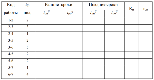 Задание: Провести расчет сетевого графика в табличной и графической форме. Рассчитать резервы времени работ. Определить коэффициенты напряженности 3-ех путей (по выбору).
