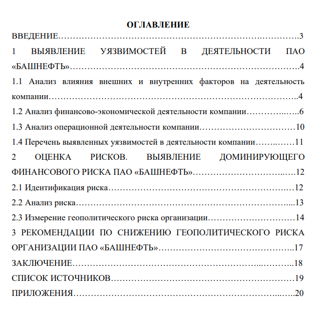 Тема работы является актуальной, так как на данный момент основными компаниями, находящимися в зоне риска являются нефтяные компании. Кризис в нефтяной сфере, который сейчас переживает мир, в значительной степени затрагивает ПАО «Башнефть», так как организация занимается добычей нефти. В связи с этим, необходимо составить перечень основных рисков данной компании и провести их оценку. Целью индивидуального задания является идентификация и оценка рисков в организации ПАО «Башнефть». Для достижения этой цели требуется решить следующие задачи: 1) выбрать организацию для исследования; 2) в результате анализа выявить уязвимости в деятельности организации; 3) провести оценку рисков организации, выявить доминирующий риск; 4) предложить рекомендации по снижению доминирующего риска. Объектом исследования является публичное акционерное общество «Башнефть». Предметом исследования является идентификация и оценка рисков в организации ПАО «Башнефть».