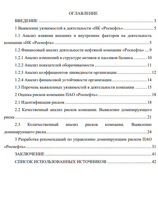 Компания ПАО «Роснефть» является одной из самых крупных нефтяных компаний в стране. В своей деятельности она подвержена большому количеству рисков и, прежде всего, риску потерь из-за непредсказуемого изменения цен на нефть. В рассматриваемой компании ПАО «Роснефть» имеется система управления рисками, однако в условиях резко меняющейся ситуации на рынке эта система оказывается недостаточно эффективной. Целью данной работы является разработка технологии управления наиболее опасным риском в компании НК «Роснефть». Для достижения цели, были поставлены следующие задачи: - выбрать организацию для исследования; - в результате анализа выявить уязвимости в деятельности организации; - провести оценку рисков организации, выявить доминирующий риск; 4 - разработать рекомендации по управлению доминирующим финансовым риском.