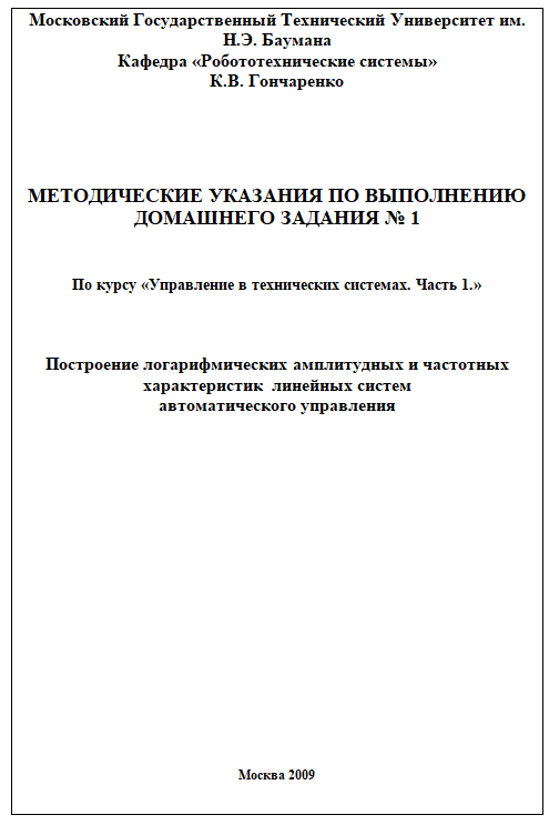 Для студентов МГТУ им. Н.Э.Баумана по предмету Управление техническими системами (УТС)К.В. Гончаренко - Методические указания по выполнению ДЗ №1 - Построение логарифмических амплитудных и частотных характеристик линейных систем автоматК.В. Гончаренко - Методические указания по выполнению ДЗ №1 - Построение логарифмических амплитудных и частотных характеристик линейных систем автомат