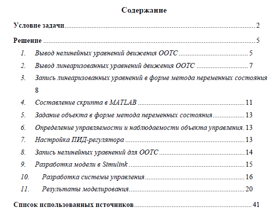 1) Разработать линеаризованную математическую модель (ММ) объекта управления в форме метода переменных состояния и синтезировать ПИД-регулятор поддержания угловой скорости качающейся части ООТС близкой нулю.