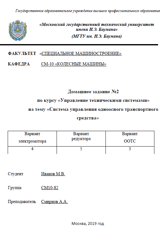 Для студентов МГТУ им. Н.Э.Баумана по предмету Управление техническими системами (УТС)Вариант 4.5.3 - ДЗ №2 - Система управления одноосного транспортного средстваВариант 4.5.3 - ДЗ №2 - Система управления одноосного транспортного средства