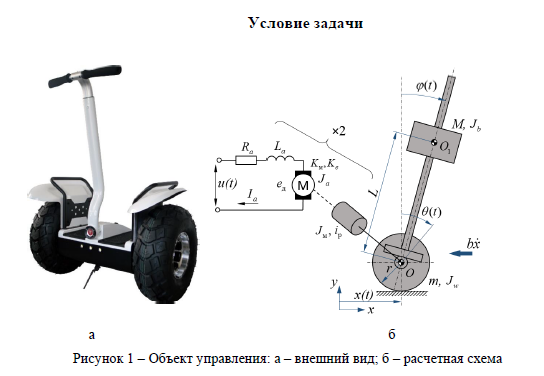 Объект управления представляет собой двухколесное одноосное транспортное средство (ООТС) с электрическим приводом. На рисунке 1, б изображена расчетная схема для данного ООТС. Рассматривается прямолинейное движение ООТС по ровной опорной поверхности. Колесо катится без проскальзывания. Условно предполагается, что привод осуществляется двумя одинаковыми электродвигателями постоянного тока (ДПТ) через понижающие редукторы.