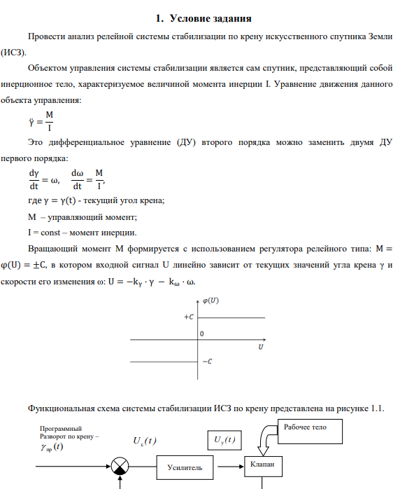Провести анализ релейной системы стабилизации по крену искусственного спутника Земли (ИСЗ). Объектом управления системы стабилизации является сам спутник, представляющий собой инерционное тело, характеризуемое величиной момента инерции I. Уравнение движения данного объекта управления: