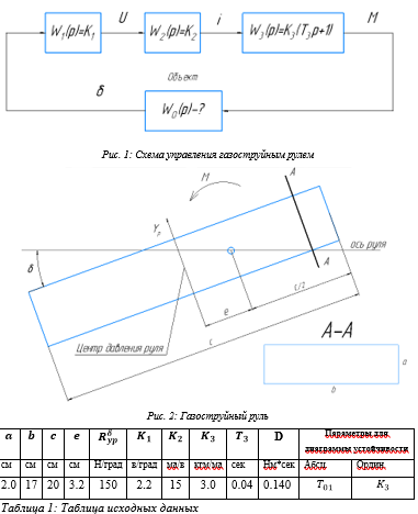 Газоструйный руль для простоты представляется в виде пластины с указанными на схеме размерами (рис. 2). Отклонение руля фиксируется потенциометром обратной связи, установленным на оси руля. Сигнал потенциометра через усилитель-преобразователь попадает на рулевую машину с обратным знаком, чтобы парировать возникшие отклонения.