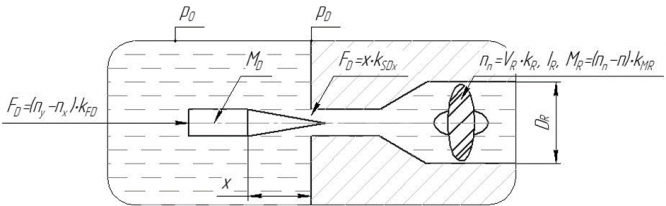 Шток дросселя имеет линейную характеристику SD(x) площади проходного сечения от линейного положения (от полностью закрытого положения) с коэффициентом пропорциональности kSDx. Масса штока дросселя MD, а комплексный коэффициент управления (отношение осевого усилия на штоке дросселя к невязке частоты вращения ротора расходомера) kFD. Управляющее воздействие считать мгновенным. Действием гидростатических и гидродинамических сил на шток пренебречь.