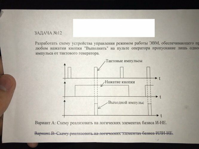Разработать схему устройства управления режимом работы ЭВМ, обеспечивающего при любом нажатии кнопки «Выключить» на пульте оператора пропускание лишь одного импульса от тактового генератора