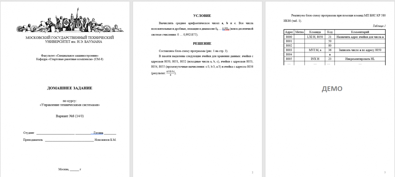 Для студентов МГТУ им. Н.Э.Баумана по предмету Управление техническими системами (УТС)Составление алгоритма и программы вычисления среднего арифметического трех чисел в машинных кодах микропроцессора KP580BM80AСоставление алгоритма и программы вычисления среднего арифметического трех чисел в машинных кодах микропроцессора KP580BM80A