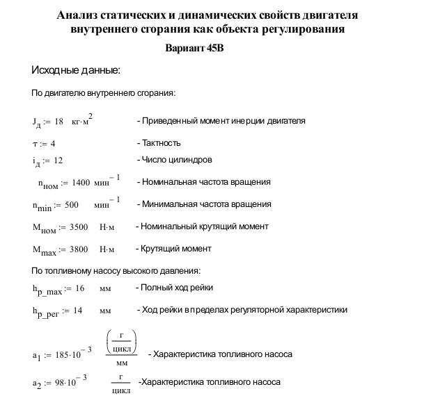 Главная » Учебные материалы » Управление техническими системами (УТС) » Домашние задания » МГТУ им. Н.Э.Баумана » 6 семестр » Номер 1 » Вариант 4-5-В » Анализ статических и динамических свойств двигателя внутреннего сгорания как объекта регулирования